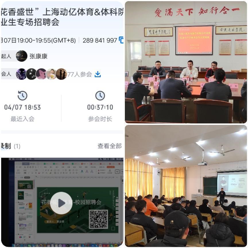 近期,学院还积极邀请了杭州捷茵体育文化有限公司、上海动亿体育文化发展有限公司、上海瑜民健身管理有限公司等用人单位进校开展专场招聘会。会后,杭州捷茵体能、上海动亿体育等用人单位与体育教育、运动训练专业等多名毕业生达成就业意愿,并签订就业协议。