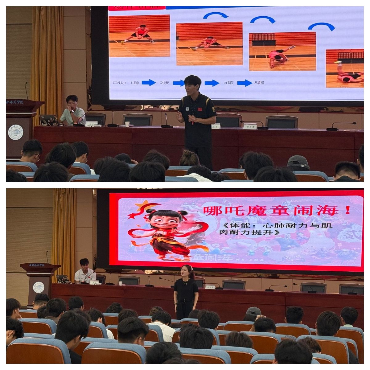 体育教育系主任曹垚在主持中介绍了活动主题、背景及重要意义。随后,校级比赛特等奖获得者代雅如作为学生代表发言,分享了参赛心得与专业成长感悟。在备受瞩目的优秀教学展示环节,代雅如、刘淦、王浩任、王帅四位校级特等奖获得者依次登台,凭借扎实的教学基本功、创新的教学设计和良好的课堂驾驭能力,充分展现了体育教育专业学子的卓越教学风采。
