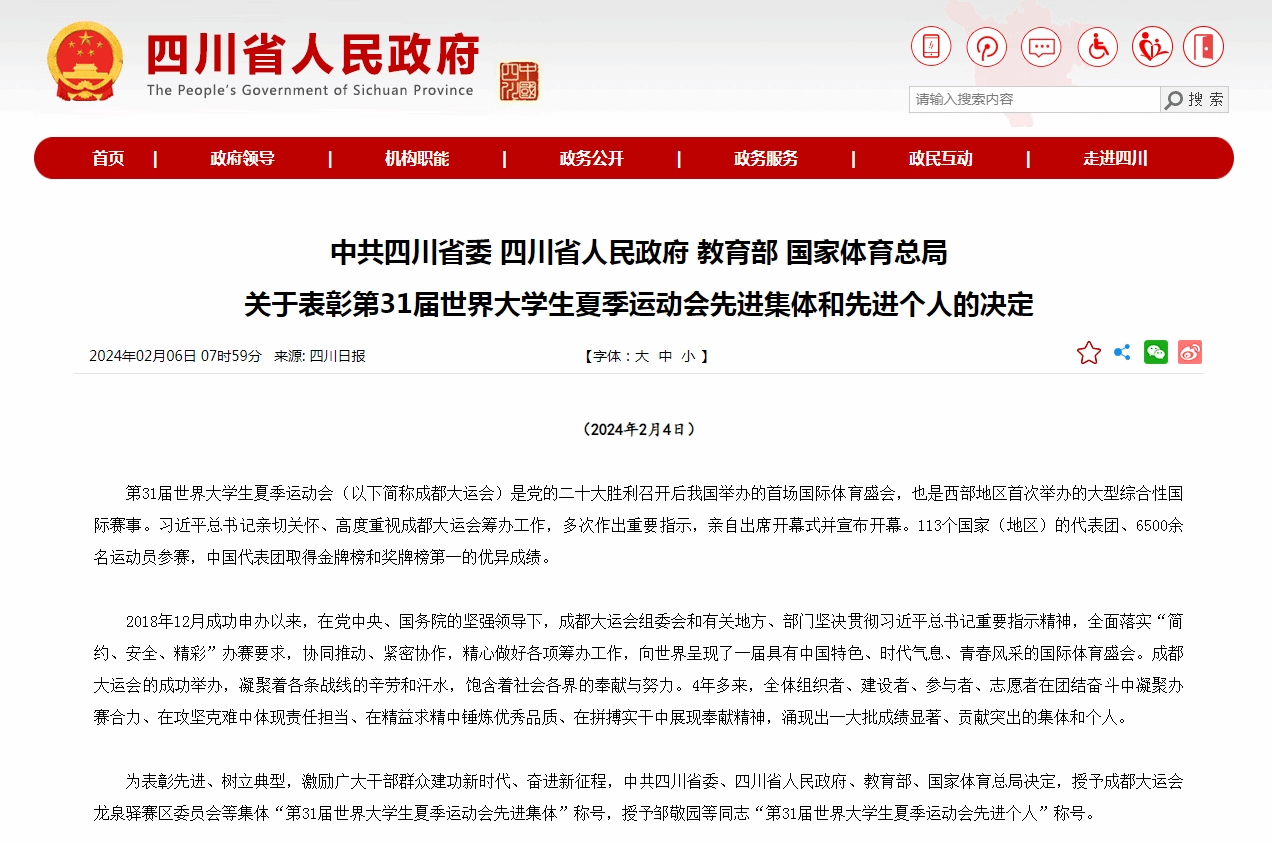 为表彰先进、树立典型,激励广大干部群众奋进新征程、建功新时代。2月4日,中共四川省委、四川省人民政府、教育部、国家体育总局联合印发《关于表彰第31届世界大学生夏季运动会先进集体和先进个人的决定》,我校太阳成集团tyc522cc荣获“第31届世界大学生夏季运动会先进集体”,2021级体能训练专业胡凯被授予“第31届世界大学生夏季运动会先进个人”称号。