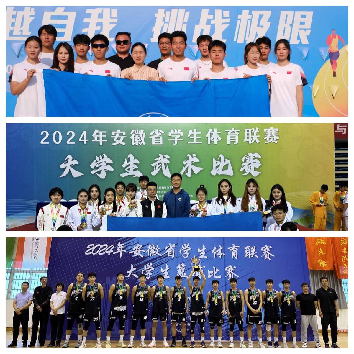 在充满挑战和机遇的2024年,合师学子在各级各类体育竞赛中展现出高水平的专业能力,190余名学生、15位教练员、16支体育代表队参加全国大学生体育比赛和安徽省大学生体育联赛,他们全力以赴,发扬“自强不息,追求卓越”的合师精神,最终获得18个冠军、20个亚军、20个季军的好成绩,共计获奖101项,多个项目打破赛会记录,并实现历史性突破,展现合师学子努力拼搏、奋勇争先、团结协作、永不言败、积极向上的精神风貌。