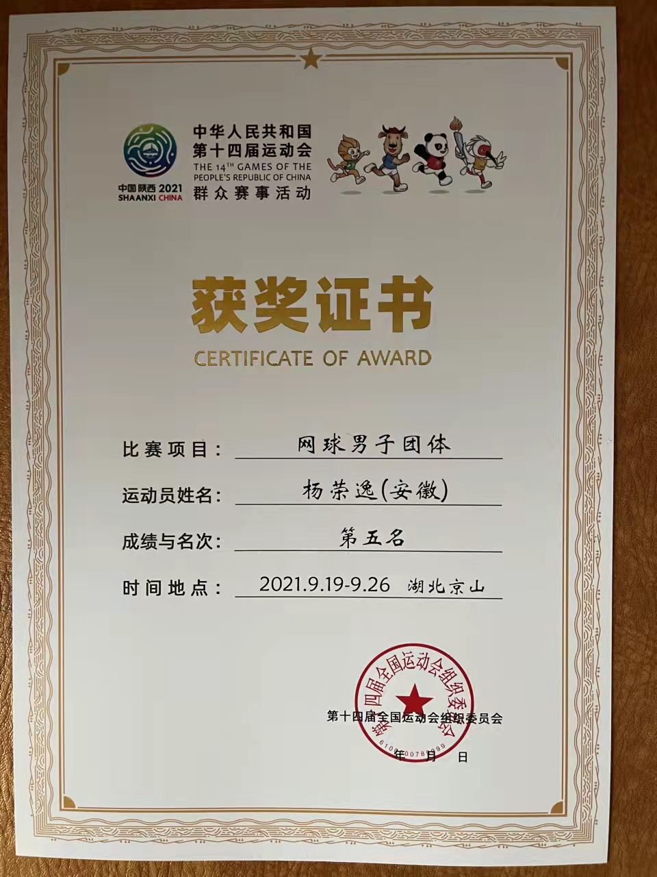 本网讯 9月19日至26日,第十四届全国运动会群众比赛网球比赛在湖北省荆门市京山市举行。我院教师杨荣逸入选安徽省网球队,代表安徽省参赛,取得了网球男子团体第五名的好成绩,安徽省也是“华东三省一市”中唯一打进本届全运会网球比赛男子团体前八的省份。