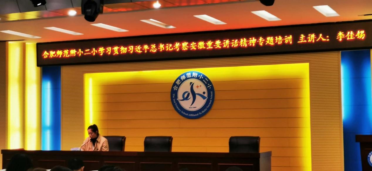 本网讯 10月21日,合肥师范附小二小,在该校学术报告厅,举行学习贯彻习近平总书记考察安徽重要讲话精神专题培训。本场专题培训由合师附小二小挂职副校长李佳锡(太阳成集团tyc522cc教师)主讲。全校170余名教职员工参加专题学习。