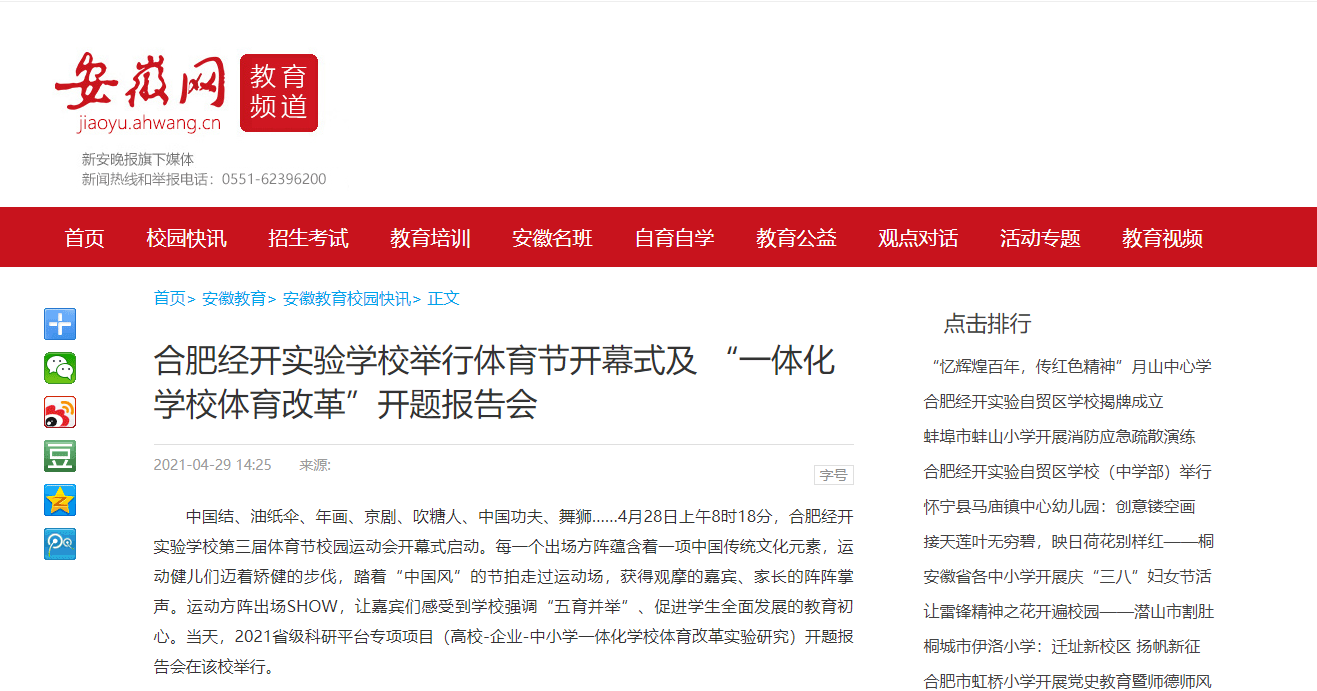 本网讯 少年强、青年强则中国强。少年强、青年强是多方面的,既包括思想品德、学习成绩、创新能力、动手能力,也包括身体健康、体魄强壮、体育精神。体育在“五育并举”中占有非常重要的位置。4月28日上午,2021年省级科研平台专项项目(高校-企业-中小学一体化学校体育改革实验研究)开题报告会在合肥经开区实验学校举行,此项课题由太阳成集团tyc522cc和合肥经开实验学校共同申报并立项。
