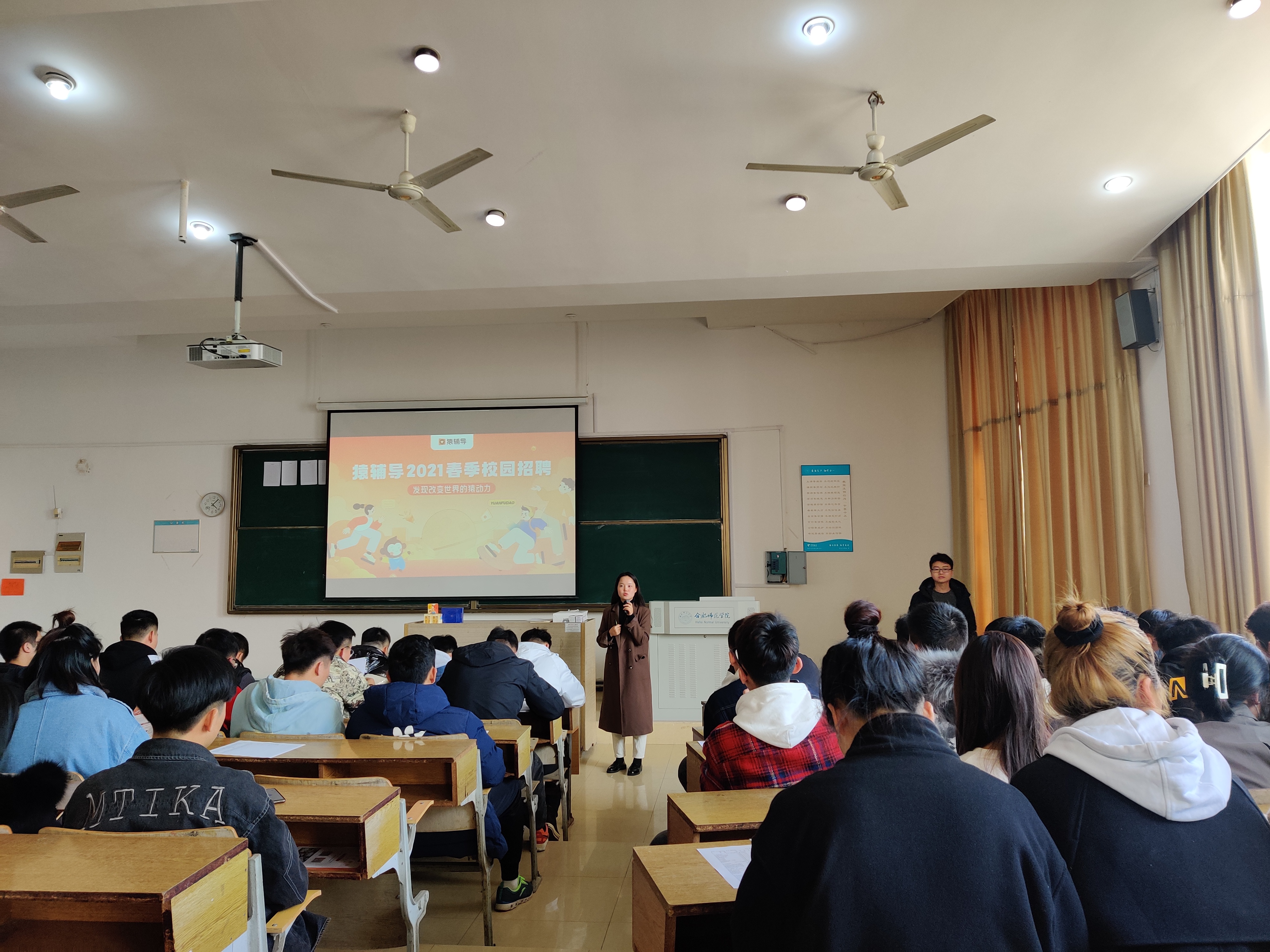 本网讯 为进一步贯彻落实中央“六稳”、“六保”要求,按照学校就业创业处和体科院2021届毕业班就业创业工作小组部署,学院积极组织协调,3月4日下午,在博约楼108教室组织开展春季学期首场就业招聘宣讲会,猿辅导(合肥地区)、安徽熊彩体育科技有限公司等来校进行专场招聘宣讲,2021届毕业生全部到场参会,宣讲会由毕业班辅导员陈山山主持。