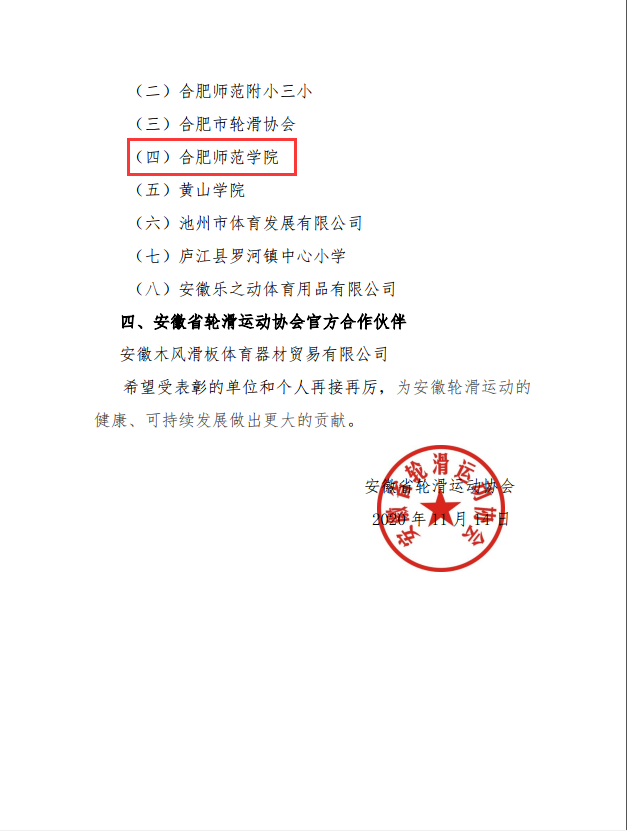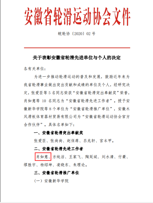 tyc522cc太阳成集团及教师肖如意受安徽省轮滑运动协会表彰,肖如意老师获评安徽省轮滑先进工作者。tyc522cc太阳成集团获评安徽省轮滑推广单位。