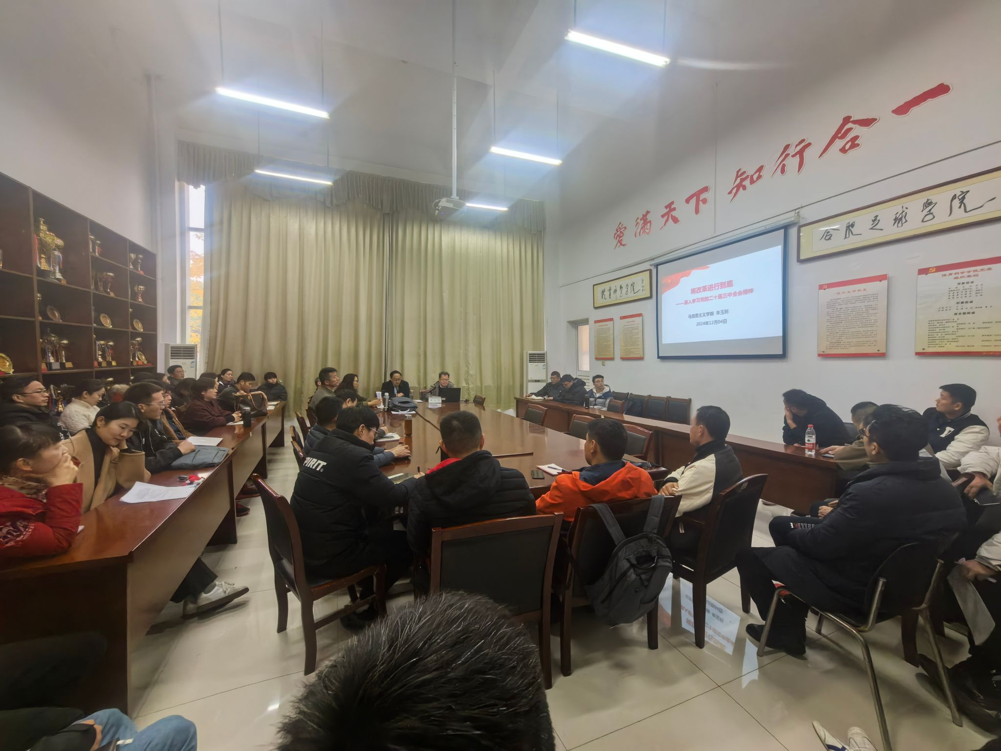为深入学习贯彻党的二十届三中全会精神,12月4日,太阳成集团tyc522cc邀请“思责守正”宣讲团团长、马克思主义学院教师朱玉利教授来院宣讲党的二十届三中全会精神。宣讲会由党委书记赵波主持,学院全体教职工参加。