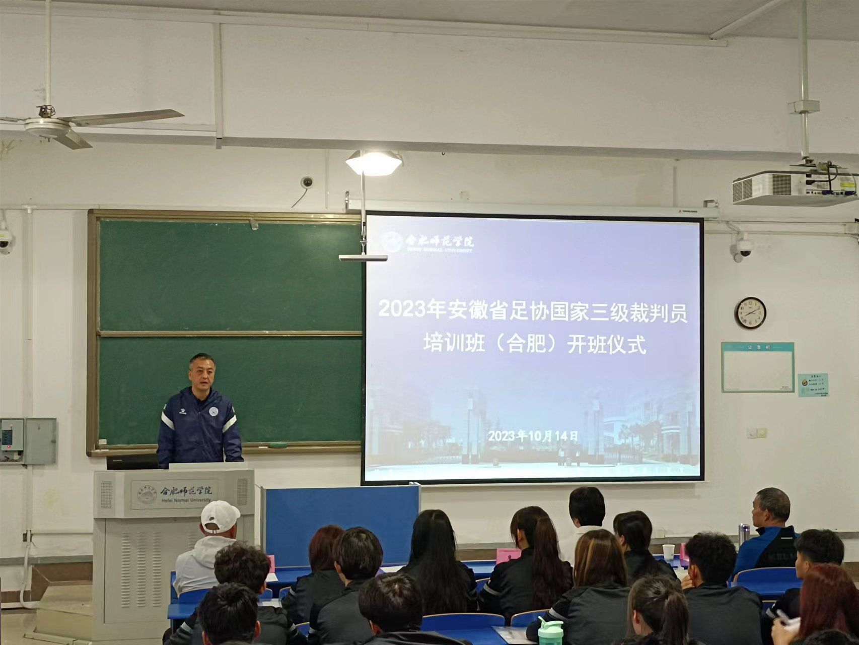 10月14日上午,培训班开班仪式在学院锦绣校区举行。太阳成集团tyc522cc副院长席莉,合肥市足协常务副主席、秘书长王欣,合肥市足协副秘书长、裁委会主任谢长征,合肥市足协裁委会副主任、本次培训安徽省足协指定讲师邵安强,合肥市足协副秘书长黄忠芬,合肥市足协裁委会副主任李明,合肥市足协裁委会委员陈亚洲,以及全体参训学员参加。