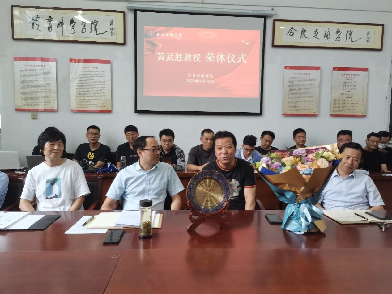赵波代表学院对黄武胜教授多年来立足岗位,教书育人,兢兢业业,在学院发展、学科建设、教学改革、大学体育、校园体育文化、青年教师培养等方面作出的贡献表示衷心的感谢。他希望,学院广大青年教师要以老教师为榜样,传承和发扬矢志树人、忠诚事业的奉献精神,兢兢业业、严谨求实的工作作风,在教书育人岗位上作出更大的贡献,团结奋斗,共同推动体科院实现新的更大发展,希望黄武胜教授继续关心和支持学院发展,常回家看看,并祝愿黄武胜教授退休生活幸福安康。