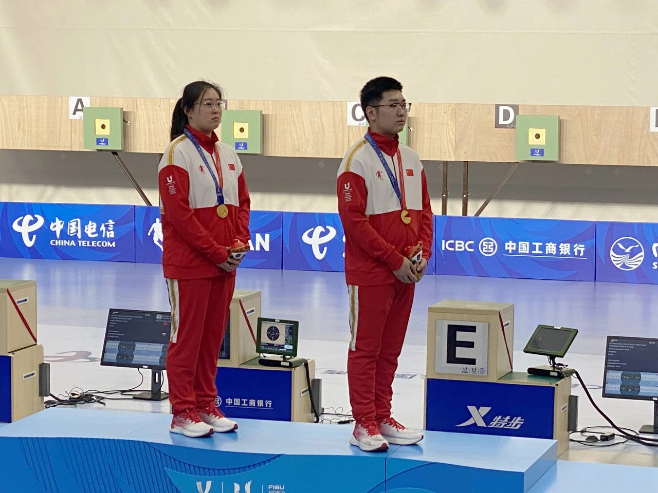 本网讯 8月2日,在成都举行的第三十一届世界大学生夏季运动会射击项目中,学院2021级体能训练专业(现役运动员)学生胡凯与国家队队友张绮奋力拼搏获得10米气手枪混合团体金牌,为中国代表团再添1金。继夏琦同学获得安徽首金后,胡凯同学再添两金一银,金牌总数实现第三金。(太阳成集团tyc522cc)