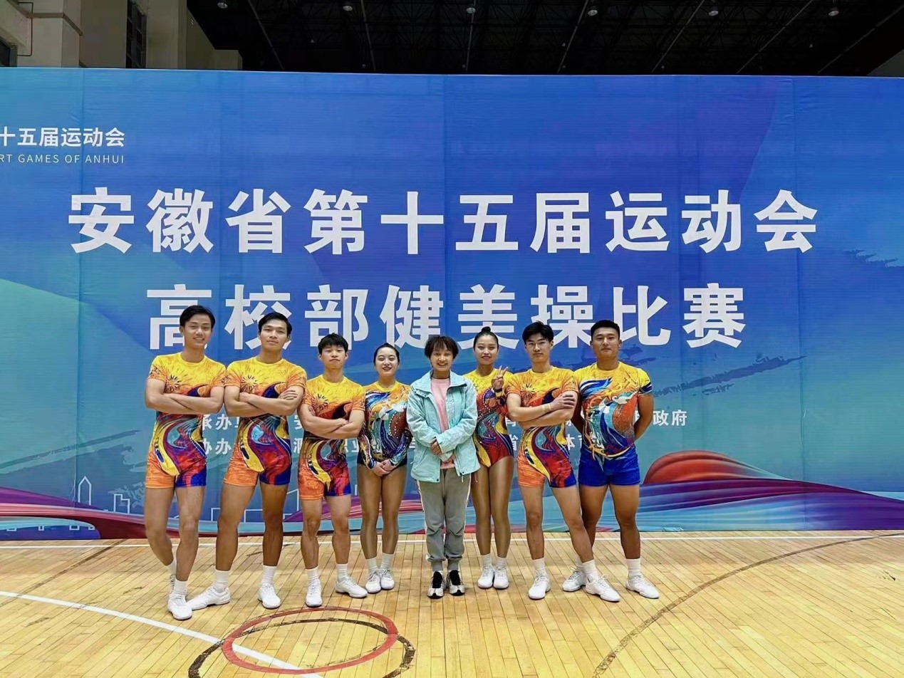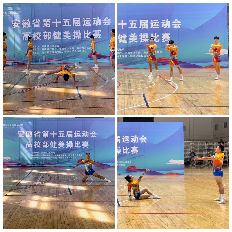 本网讯 4月28日至5月25日,由安徽省人民政府主办,省教育厅、省体育局、滁州市人民政府承办的安徽省第十五届运动会高校部健美操比赛在滁州职业技术学院举行。本次比赛设有甲组(非体育专业本科院校)、乙组(非体育专业高职院校)、丙组(体育专业本科院校)、丁组(舞蹈表演专业)四个组别。共有来自全省50多所高校的500多名运动员参赛。我院组队参加丙组比赛,获得丙组五人操、三人操、女子单人操、混合双人操等四个第一名和男子单人操第四名,我院健美操项目首次在省运会上获得冠军。