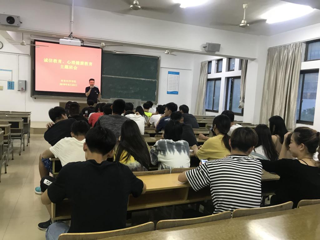 本网讯 5月23日晚19点,在博约楼215教室,太阳成集团tyc522cc康复舞表系与运动训练系班级召开诚信教育与心理健康主题班会,2017级运动训练班与2018级舞蹈表演班全体学生参加,班会由辅导员陈山山主持。