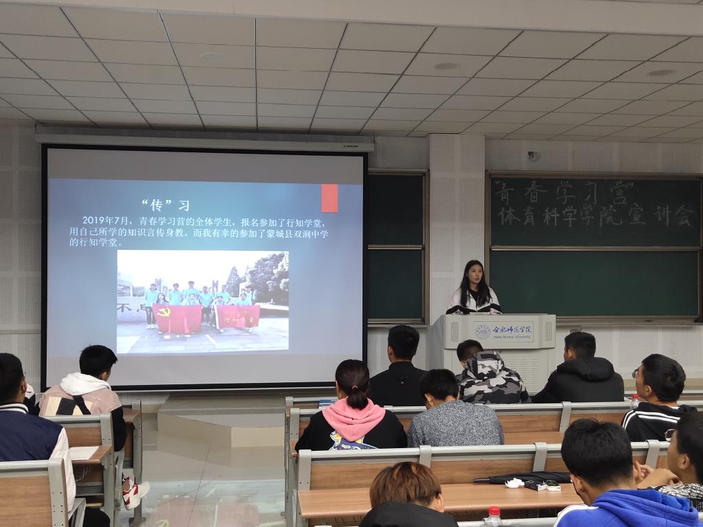 本网讯 为了帮助2019级新生更好地了解“青春学习营”,11月17日晚上,太阳成集团tyc522cc在滨湖校区博学楼A108教室开展“青春学习营”主题宣讲活动。此次活动由首届“青春学习营”学员2017级运动训练专业麻艳雯同学主讲,体科院2019级全体新生参加。