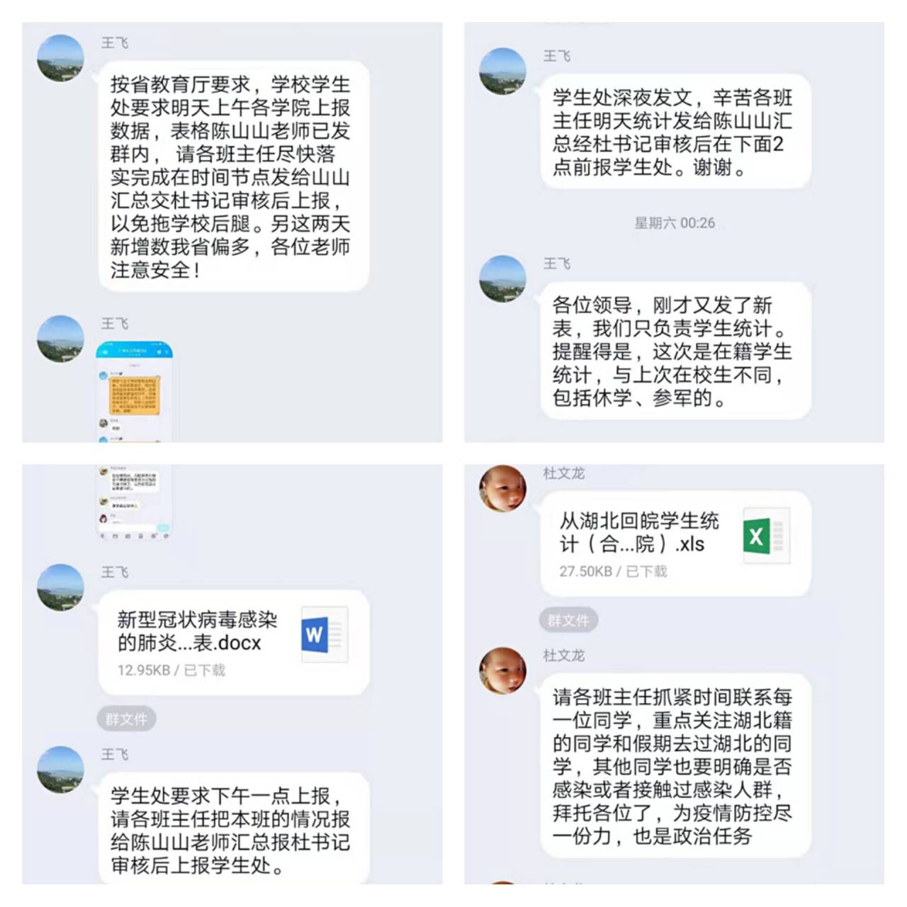 学院辅导员班主任积极利用QQ、微信、今日校园APP等线上平台进行新型冠状病毒知识宣传、疫情预警。教育部和安徽省教育厅《致广大学生和家长一封信》全覆盖传达到位,辅导员及时通过班级群组转发疫情防控舆情,针对部分同学的恐慌状况,开展适时适当的心理疏导,引导学生了解疫情、安心在家,积极防护、珍爱生命,为国家整体疫情防控做出自己的贡献。
