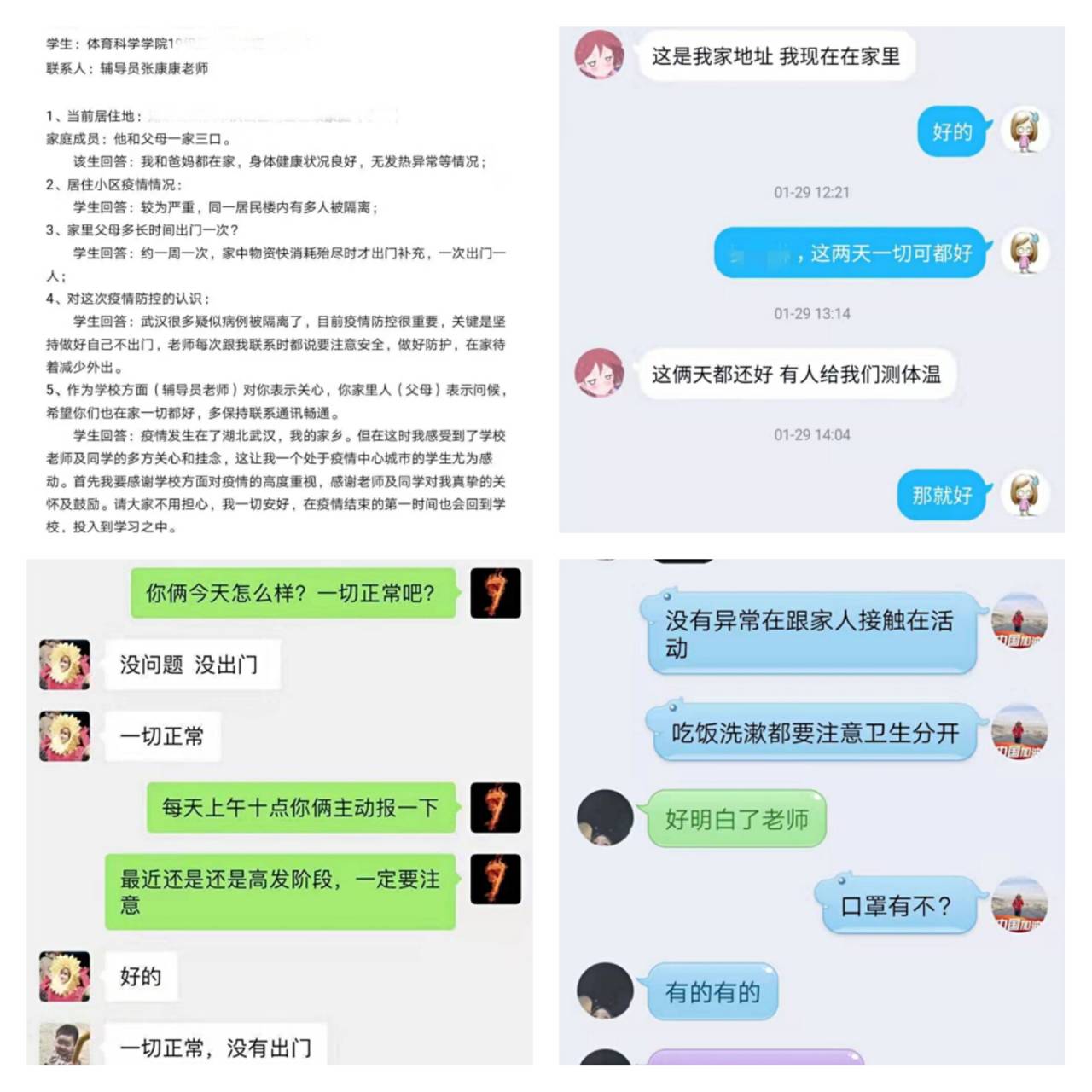 在学校防控疫情决策部署下,辅导员队伍第一时间把握全体学生坐标动向,一个都不能少。及时梳理出疫情中心的武汉籍和湖北籍学生,在确定学生身体健康状态的同时积极开展心理疏导,加强学生自我防护知识意识。